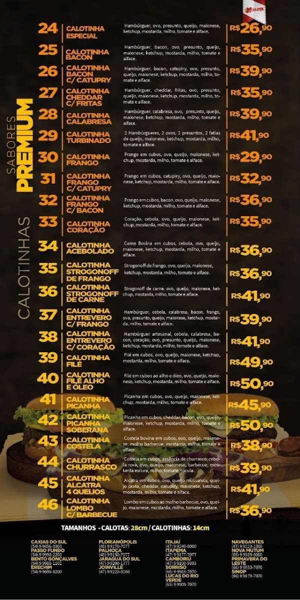 The premium section elevates the experience with more elaborate preparations and bolder profiles. Choices such as CALOTA ACEBOLADO, CALOTA STROGONOFF DE FRANGO, CALOTA STROGONOFF DE CARNE, CALOTA ENTREVERO C/ FRANGO, and CALOTA ENTREVERO C/ CORAÇÃO bring variety and depth to the menu, blending creamy sauces, well-seasoned proteins, and hearty accompaniments. Together, these dishes showcase the restaurant’s ability to balance indulgence with comfort, staying true to its concept while still offering something special for those who want to explore beyond the basics.